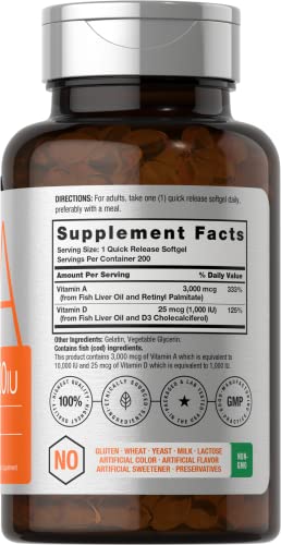 • STRONG FORMULA: Delivers 3,000 mcg of Vitamin A plus 25 mcg (1,000 IU) of Vitamin D3 per softgel