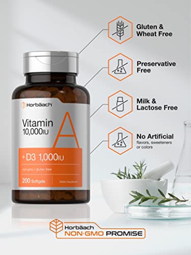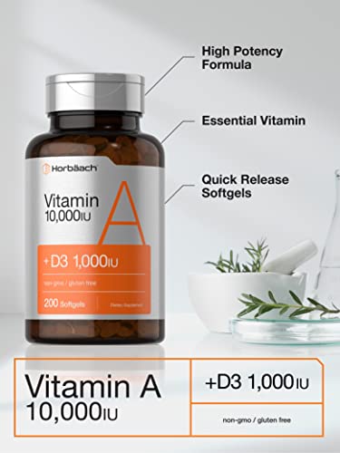 Vitamin A 10000 IU Softgels | 200 Count | with Vitamin D3 | Non-GMO, Gluten Free Supplement | by Horbaach